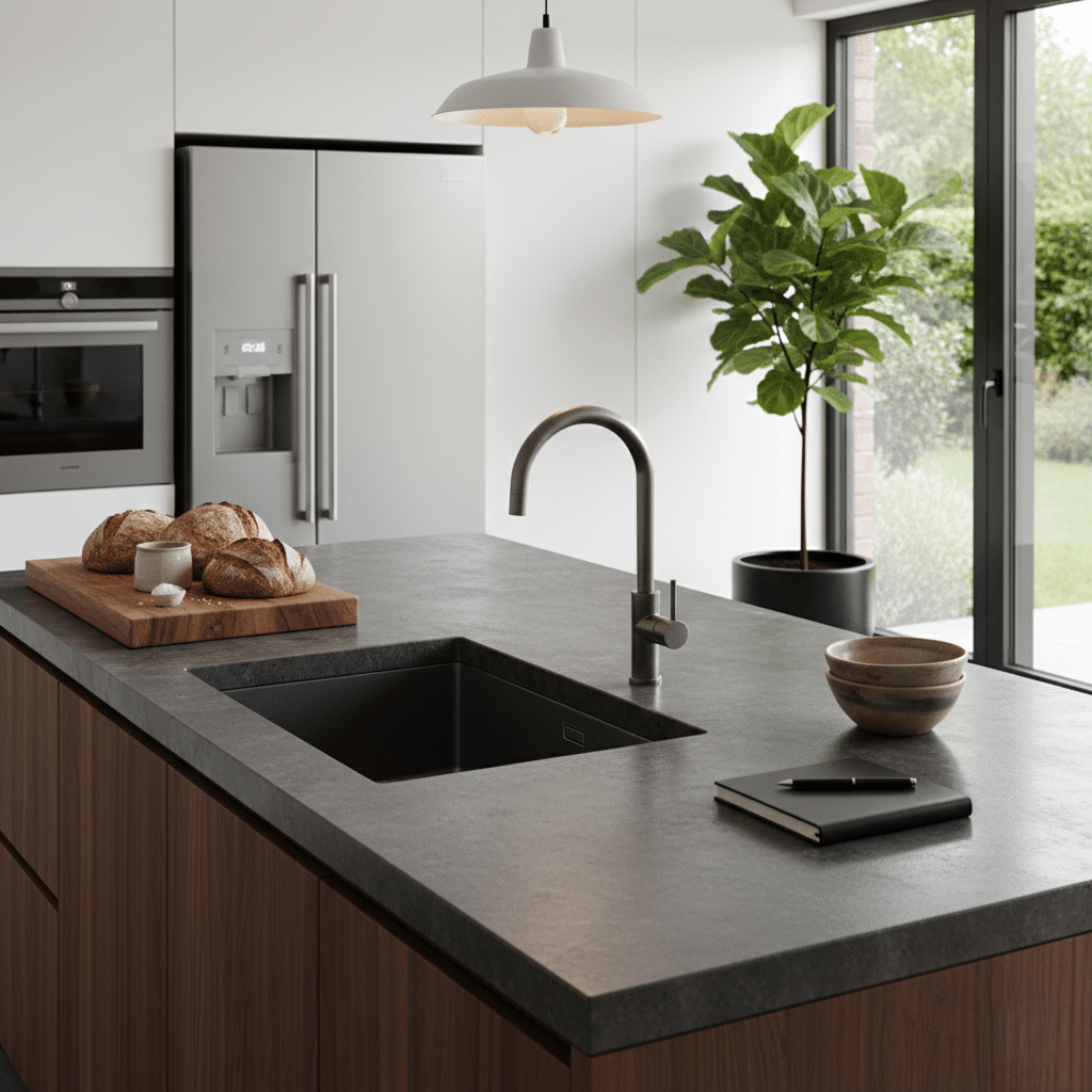 - In-stock natural and engineered stone, chosen for durability, character, and long-term performance