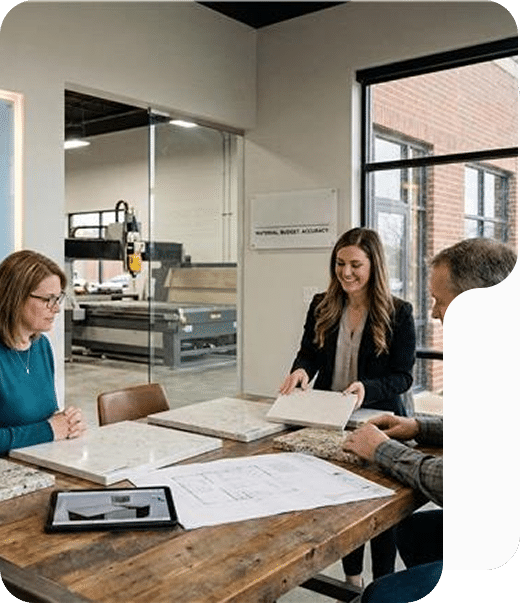 Clients often travel or collaborate remotely for access to in-stock stone, square-foot pricing, and a fully in-house process that keeps projects moving without compromise to design intent.