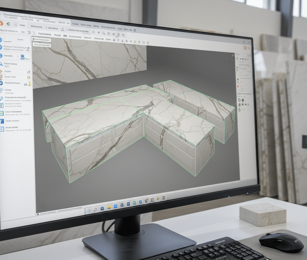 Here’s where your vision meets reality. We take a high-resolution image of your selected slab and overlay it onto your exact kitchen or bathroom layout. You’ll see how the veins flow, where the seams fall, and how each piece connects. You can request adjustments before anything is cut. This is your chance to make sure the final product looks exactly how you imagined it.