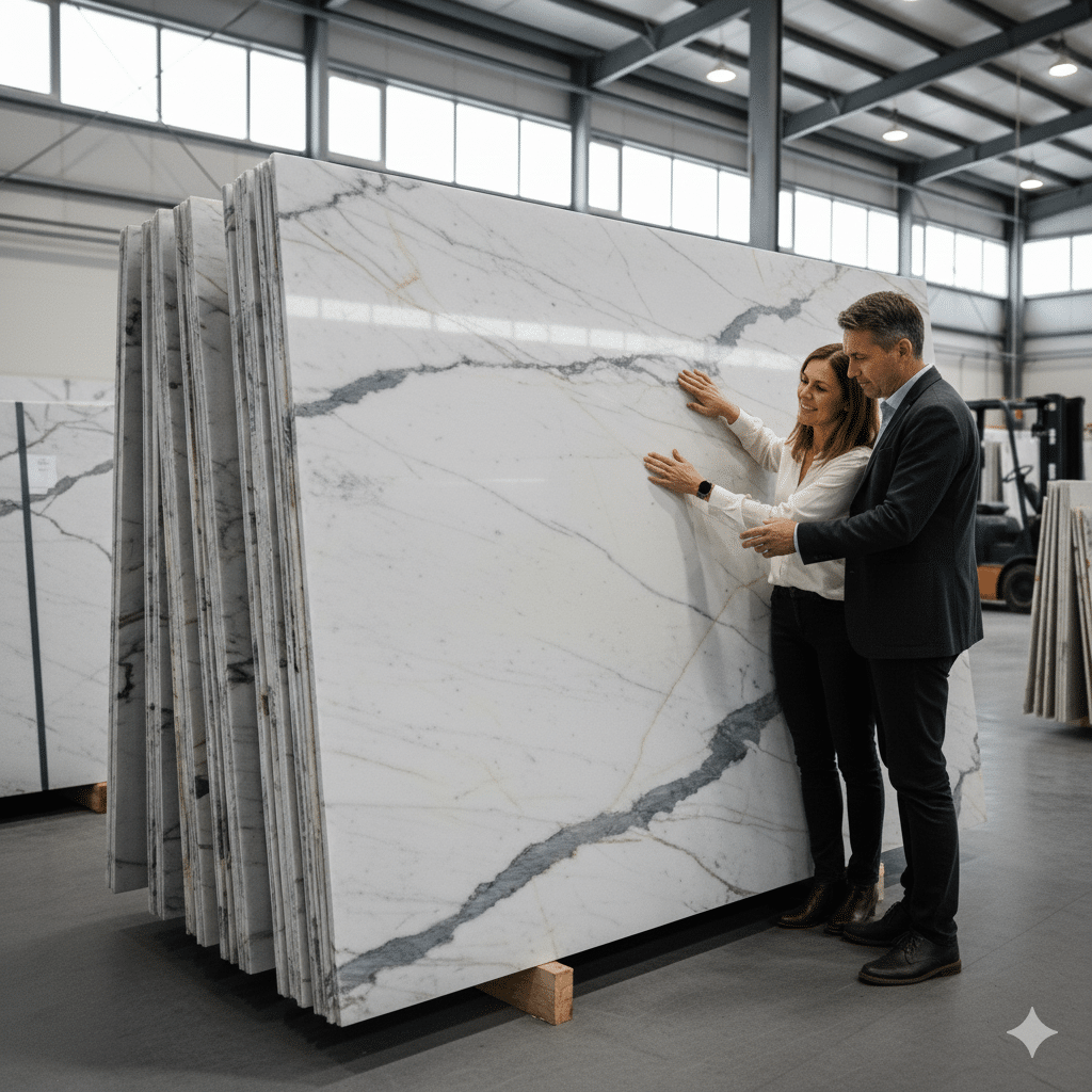 In our showroom, you’ll see full slabs in natural light and choose the exact one we’ll use. We walk you through movement, tone, and veining, helping you see how the stone will carry through your space. You’re not picking from a sample. You’re selecting the real thing that sets the tone for the entire design.