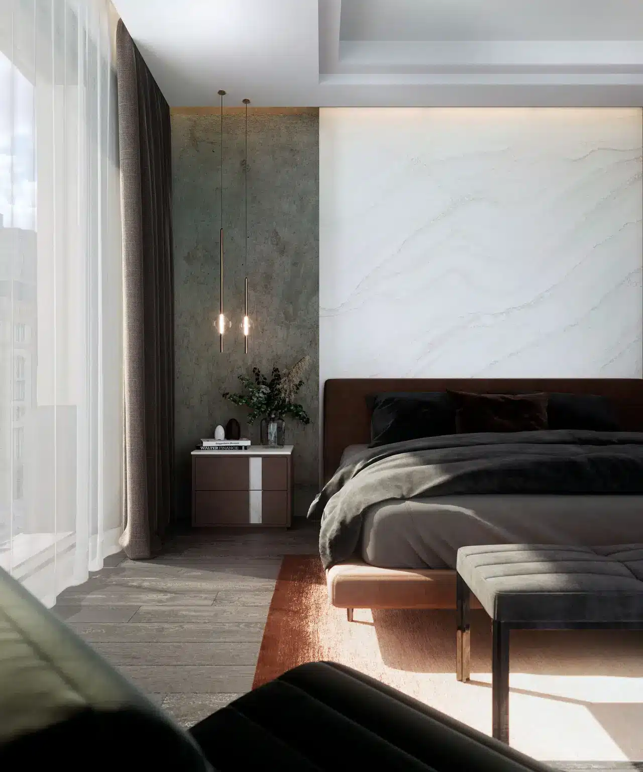 Statement meets subtle in this movement-rich design that features cool gray and warm, sand-honey tonalities, combining the best of bold patterns and soft, tone-on-tone design.