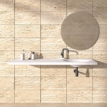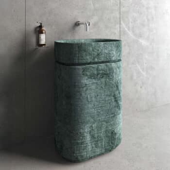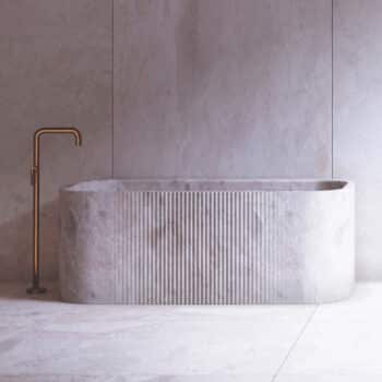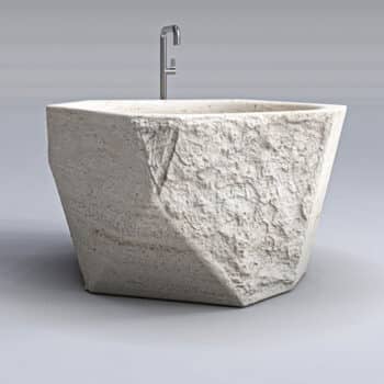 Bathing becomes an art form with pieces designed to transform daily rituals into spa-like experiences. From carved bathtubs to textured vanities, every piece balances natural stone’s permanence with striking modern form.